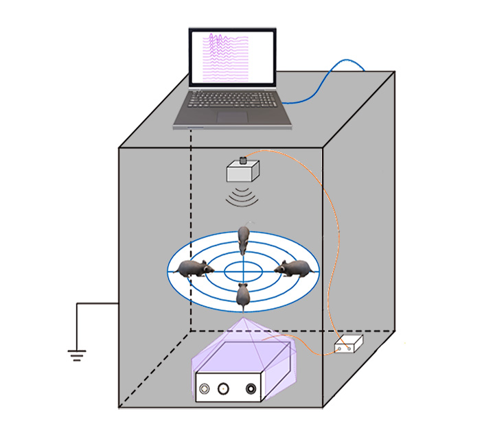 多通道开场听性脑干反应测试系统(ABR)通过给予不同强度的声刺激诱发并记录大脑皮层的电位反应,以此检查结果来判断听力损失情况,常用于听力筛查和听阈评估。该设备具备四通道,可同时测试四只小鼠的听性脑干反应。设备自带三重声电隔离系统,隔音效果达 60dB。 听性脑干反应是短潜伏期电位,可用来鉴别传音性耳聋、脑干病变以及听神经瘤等。通过对小鼠的听性脑干反应的测试,可帮助研究人员开展听力相关的研究。